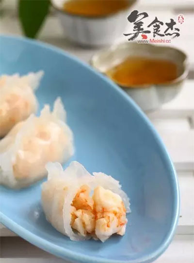6、餃子皮中間放入餡料,再放一個(gè)大塊的蝦肉,將邊緣捏緊成餃子形狀;