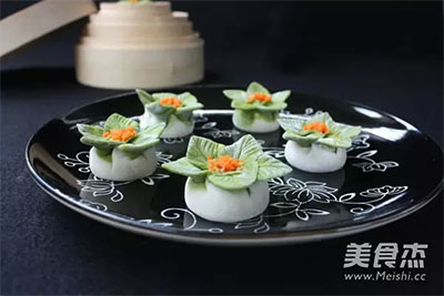 4、最后放入少許胡蘿卜末裝飾,制成翡翠花朵餃生坯。將生坯放入蒸鍋中,大火隔水蒸約12分鐘即可。