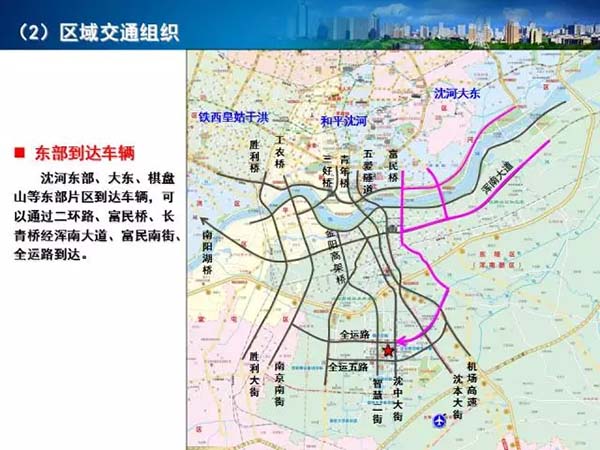 沈河?xùn)|部、大東、棋盤山等東部片區(qū)到達(dá)車輛,可以通過二環(huán)路、富民橋、長青橋經(jīng)渾南大道、富民南街、全運(yùn)路到達(dá)。