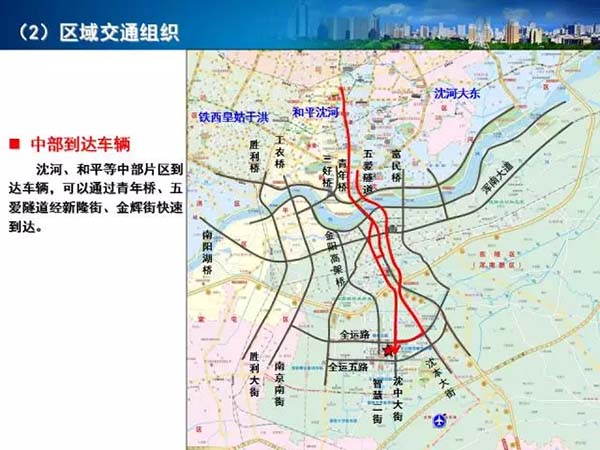 沈河、和平等中部片區(qū)到達(dá)車輛,可以通過青年橋、五愛隧道經(jīng)新隆街、金輝街快速到達(dá)。