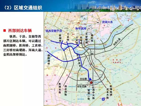 鐵西、于洪、皇姑等西部片區(qū)到達(dá)車輛,可以通過南陽湖橋、勝利橋、工農(nóng)橋、三好橋經(jīng)南堤路、渾南大道、金陽高架橋到達(dá)。
