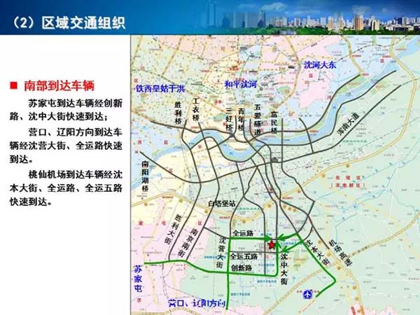 蘇家屯到達(dá)車輛經(jīng)創(chuàng)新路、沈中大街快速到達(dá);營口、遼陽方向到達(dá)車輛經(jīng)沈營大街、全運(yùn)路快速到達(dá)。桃仙機(jī)場(chǎng)到達(dá)車輛經(jīng)沈本大街、全運(yùn)路、全運(yùn)五路快速到達(dá)。