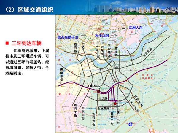 沈陽周邊城市、下屬縣市及三環(huán)附近車輛,可以通過三環(huán)白塔堡站,經(jīng)白塔河路、智慧大街、全運(yùn)路到達(dá)。