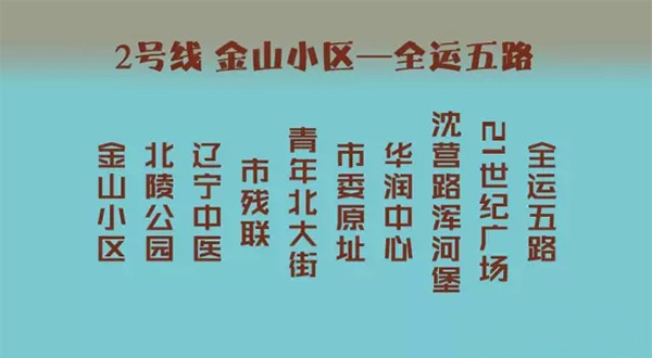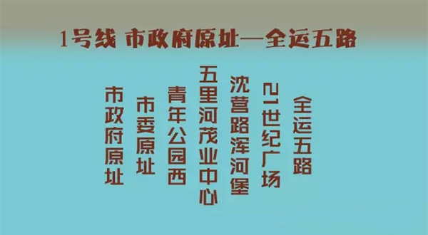 金山小區(qū)(210站點(diǎn))—北陵公園(210站點(diǎn))—遼寧中醫(yī)(220站點(diǎn))—市殘聯(lián)(214站點(diǎn))—青年北大街(214站點(diǎn))—市委原址(214站點(diǎn))—華潤(rùn)中心(214站點(diǎn))—沈營(yíng)路渾河堡(214站點(diǎn),南行單向)—21世紀(jì)廣場(chǎng)(100站點(diǎn))—全運(yùn)五路公交停車場(chǎng)