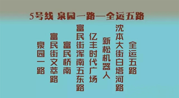 泉園一路(239/108站點(diǎn))—富民街文萃路(150站點(diǎn))—富民橋南(150站點(diǎn))—富民街渾南五東路(105站點(diǎn))—億豐時(shí)代廣場(chǎng)(有軌電車站點(diǎn))—新松機(jī)器人(有軌電車站點(diǎn))—沈本大街白塔河路—全運(yùn)五路公交停車場(chǎng)