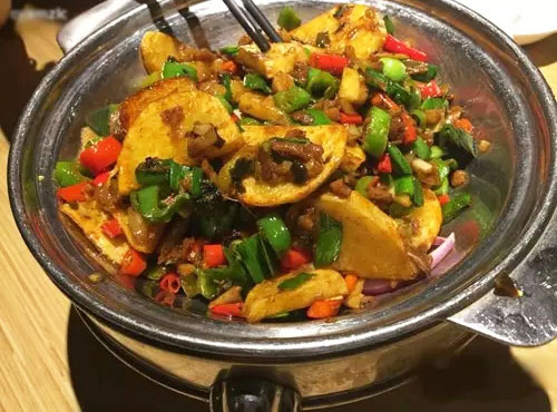 想吃辣去這家絕對(duì)是很好的選擇。但他家最辣的居然不是辣子雞啊什么的,是看似很簡(jiǎn)單的干鍋土豆片。里面全是青紅兩色的辣椒,越加熱越辣,越吃越辣,大瓶可樂(lè)自己一人就能喝一瓶!