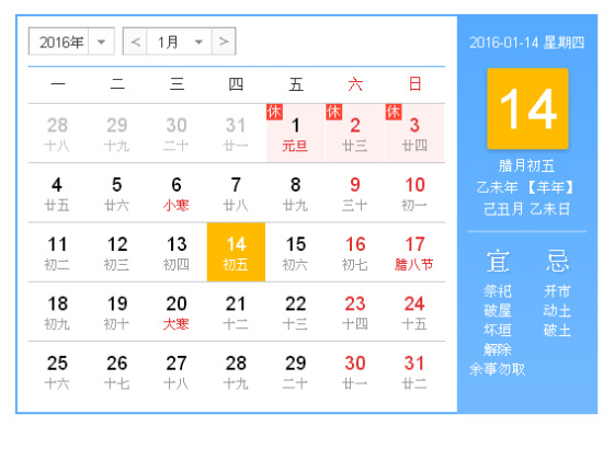 今天是2016年1月14日,星期四。