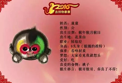 猴年春晚吉祥物"康康",由北京奧運(yùn)會(huì)吉祥物"福娃"的創(chuàng)作者韓美林大師設(shè)計(jì),以中國傳統(tǒng)水墨畫的藝術(shù)形式,表現(xiàn)"猴"的特點(diǎn)。這也是春晚歷史上第二任吉祥物。