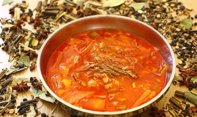 牛肉辣湯火鍋是以辣湯為湯底,放入十足的牛胸肉、大蔥、粉絲、金針菇、豆腐、圓蔥等新鮮食材,不失傳統(tǒng)風(fēng)味又符合現(xiàn)代人口味。大量的牛肉絲藏在湯里,大蔥惹味,粉絲彈滑。