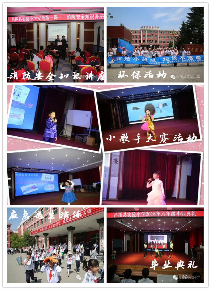 除了學(xué)習(xí)成績,學(xué)校更加注重素質(zhì)教育,所以昌圖縣實(shí)驗(yàn)小學(xué)經(jīng)常定期組織以"美好心靈,多元智能"為主題的系列活動(dòng),如"感恩母校,追夢(mèng)未來"畢業(yè)典禮;新學(xué)期安全教育——消防安全知識(shí)講座;"我是小袋鼠,垃圾不落地"環(huán)?;顒?dòng);校園歌手大賽活動(dòng);"減少災(zāi)害風(fēng)險(xiǎn),建設(shè)安全城市"應(yīng)急逃生演練活動(dòng)……