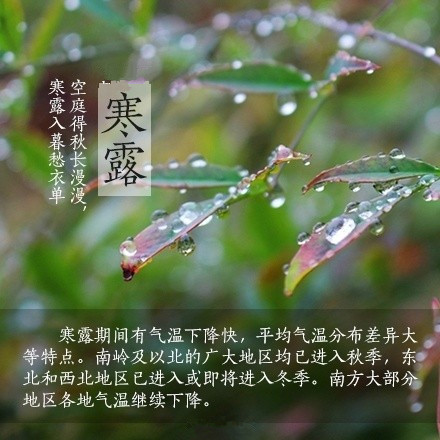 露氣寒冷,深秋節(jié)令,沈陽最低氣溫已經(jīng)跌到零度,看來冬天真的離我們不遠(yuǎn)了;北方呈深秋景象,白云紅葉,偶見早霜;
