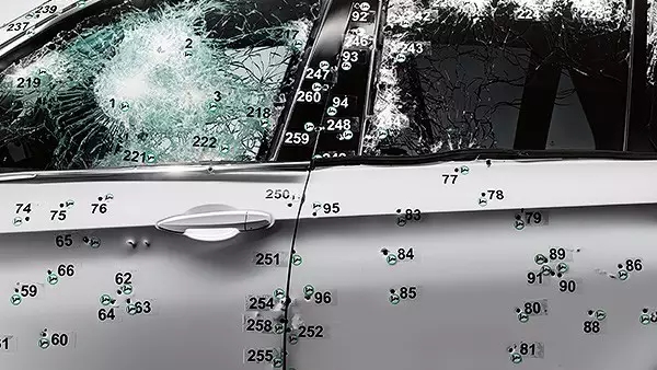 BMW防彈車都需要經(jīng)過(guò)官方認(rèn)證,但是除官方認(rèn)證規(guī)定的槍擊角度外,BMW還從可對(duì)車輛安全造成極大威脅的其他角度進(jìn)行了成百上千次測(cè)試,安全等級(jí)其實(shí)遠(yuǎn)超官方認(rèn)證要求(根據(jù)BRV 2009指南測(cè)試)。