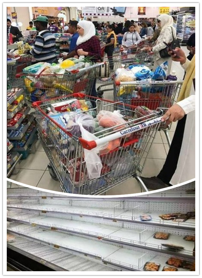 多個國家以卡塔爾支持恐怖主義活動為由,宣布與其斷交。海灣國家之間出現(xiàn)分歧并斷交并非首次。但此次卡塔爾所有的陸路通道被封,恐成為孤島。而其40%食品供應(yīng)都是從沙特阿拉伯進口的,居民因此紛紛搶購食品和飲用水,買空超市。