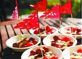 重陽糕又稱花糕、菊糕、五色糕。講究的重陽糕要做成九層,像座寶塔,上面還做成兩只小羊,以符合重陽(羊)之義。有的還在重陽糕上插一小紅紙旗,并點蠟燭燈。這大概是用"點燈"、"吃糕"代替"登高"的意思,用小紅紙旗代替茱萸。