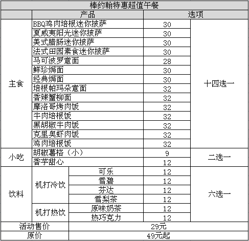 棒約翰的"小棒"已經(jīng)為廣大吃貨想到這一點(diǎn)了,小棒特別推出超值午市套餐,獎(jiǎng)勵(lì)拼搏的吃貨們:超值午市套餐,活動(dòng)售價(jià)僅需29元。