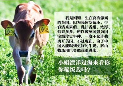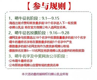輝山乳業(yè)牧場已經(jīng)擁有超過18萬頭進(jìn)口奶牛,其中有只特別的娟姍小牛要降生了,但牛寶寶還沒!有!名!字!誰愿意幫它?輝山乳業(yè)在最霸氣、最創(chuàng)意的名字中進(jìn)行海選投票,如被選中就有機會參觀輝山牧場并與萌牛寶寶見面哦!