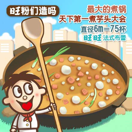 最大的煮鍋來(lái)自日本山形縣舉行的"天下第一煮芋頭大會(huì)",中間一架大鍋寬達(dá)6米,相當(dāng)于75杯旺旺法式布蕾的直徑!兩位師傅開(kāi)著消毒后的挖掘機(jī)煮,一共使用3噸芋頭、1.2噸牛肉、3500根大蔥,供3萬(wàn)人品嘗。