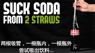 兩根吸管,一根瓶?jī)?nèi),一根瓶外嘗試吸出飲料