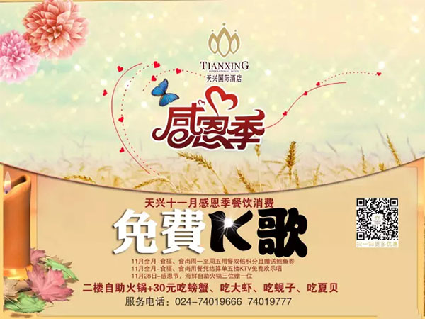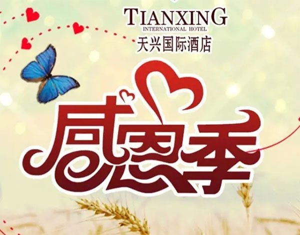 2015年還有58天就結(jié)束了,在過去的一年里,你有多少感謝的話語沒有機會說出來?有多少人幫助過你,你卻來不及說句"謝謝"?在11月份這個感恩季,跟隨天興國際酒店行動起來!