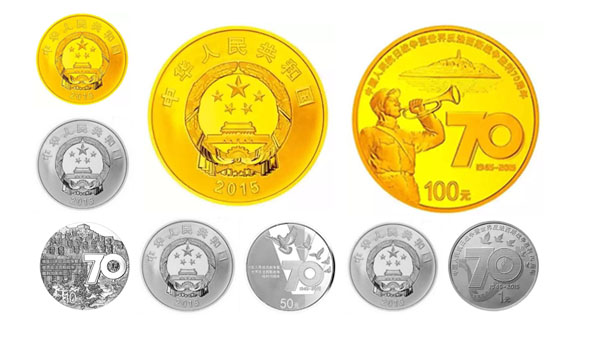 為紀念中國人民抗日戰(zhàn)爭暨世界反法西斯戰(zhàn)爭勝利70周年,中國人民銀行自2015年8月20日起陸續(xù)發(fā)行紀念幣一套,包括金銀紀念幣3枚、鎳包鋼紀念幣1枚,均為法定貨幣。金銀紀念幣由深圳國寶造幣有限公司、沈陽造幣有限公司和上海造幣有限公司三家鑄造。