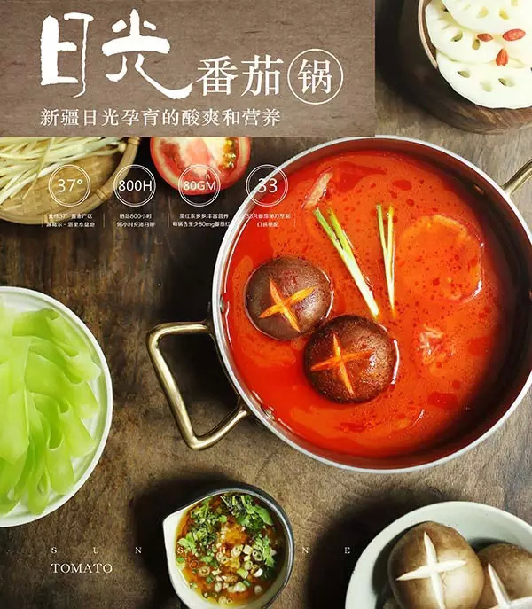 每一鍋湯汁均由33顆新鮮飽滿的新疆番茄經(jīng)過溫火慢燉而成,番茄的果實(shí)全都化為湯里的精華。